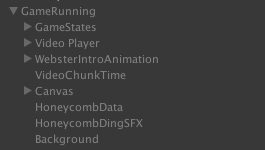 Game Running - Enables and disables the GameRunning object, which contains all the elements involved in actual gameplay. This state should enable the GameRunning object OnEntered, and depending on the activity it may or may not disable the GameRunning object OnExit.