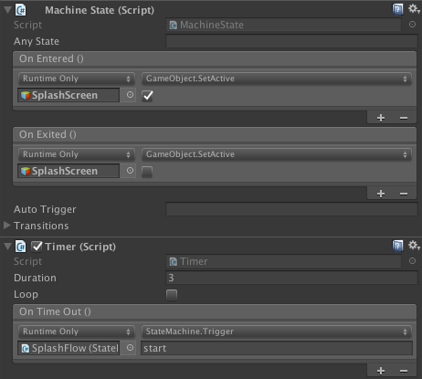 Splash Screen - Displays the introduction for each game. Depending on the activity, this could be an image, a video, or something else. If the introduction is an image, the Splash Screen state has a Timer component that will trigger the next state after a given amount of time. Otherwise, use the UnityEvent that fires when the introduction is finished (for example, OnVideoEnded) to trigger the next state.